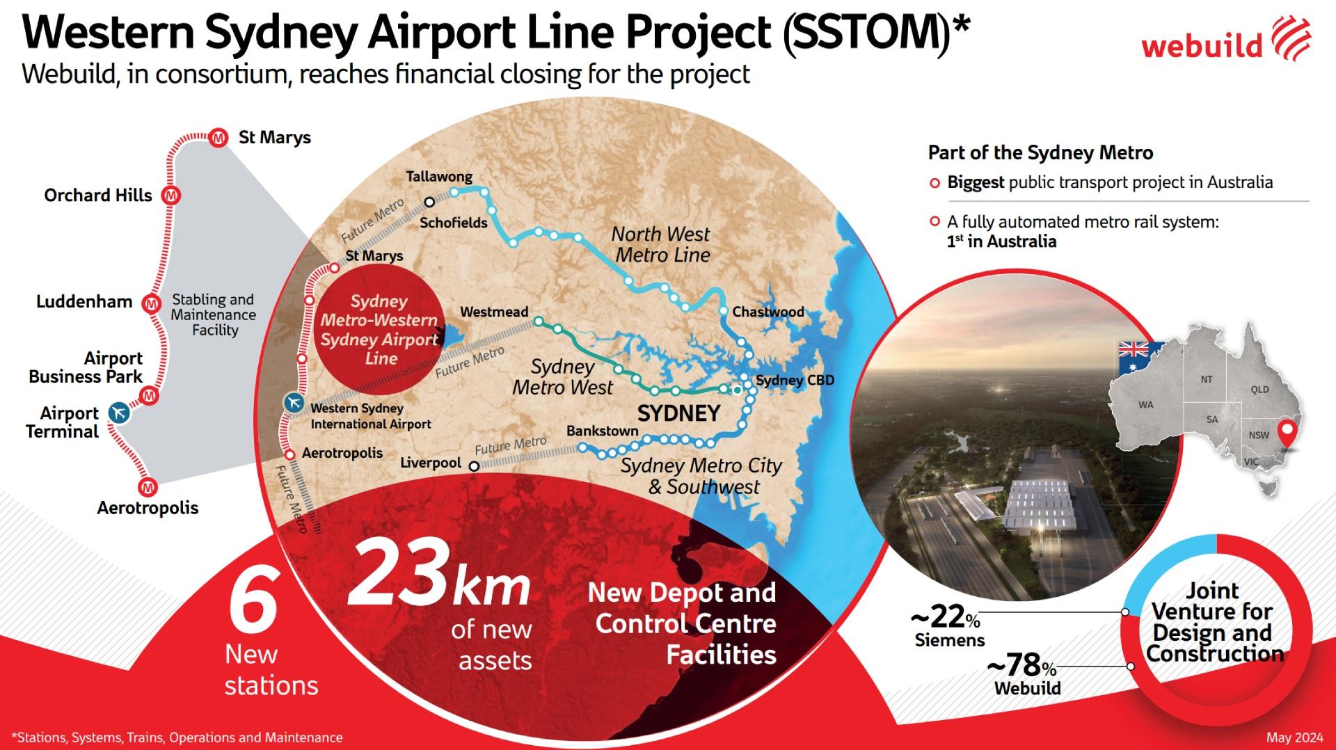 The Sydney Metro - Western Sydney Airport Metro Line, “Stations, Systems, Trains, Operations and Maintenance (SSTOM) Package” project, to be carried out with PPP (Pubblic-Private Partnership) formula, foresees building six stations, in the section between the St. Marys interchange station and the Western Sydney Aerotropolis station, a workshop depot for storing and the maintenance of trains, at Orchard Hills, but also the superstructure, the signalling systems and the mechanical and electric systems of the entire line, and the supply of new driverless trains.